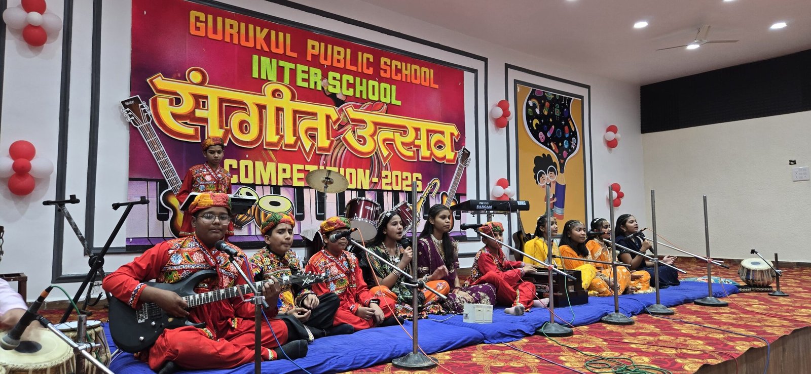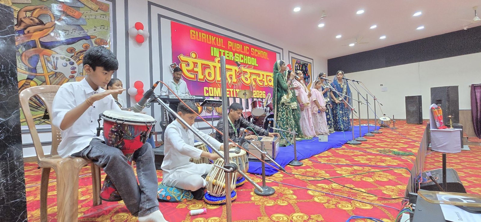 सर्वप्रथम माननीय अतिथियों के कर कमलों द्वारा माँ सरस्वती के तैलचित्र पर माल्यार्पण एवं दीप प्रज्वलन- वंदन किया गया। प्राचार्य ने सभी का आत्मीय स्वागत किया। उन्होंने इस आयोजन के उद्देश्य पर प्रकाश डालते हुए कहा कि संगीत आत्मा की भाषा है जो अपनी सरसता से सभी को वशीभूत रखने की शक्ति रखती हैं। तत्पश्चात गुरुकुल पब्लिक स्कूल, पीएम श्री केंद्रीय विद्यालय महाराजपुर ,अभ्युदय स्कूल ,अशोका पब्लिक स्कूल तथा दिल्ली पब्लिक स्कूल के प्रतिभागियों द्वारा सरस राजस्थानी व सूफी भजन का गायन किया गया। इस अवसर पर वरिष्ठ सम्मानीय अतिथियों एवं निर्णायक मंडल के सदस्यों ने भी अपने उद्गार व्यक्त किया ।प्रबंधन समिति के वरिष्ठ निदेशक महावीर जैन ने अपने उद्बोधन में कहा कि गुरुकुल विद्यार्थियों के सर्वांगीण विकास के लिए सदैव प्रयत्नशील है। विद्यार्थियों के शिक्षणेतर प्रतिभा विकास के लिए यह नवनिर्मित सभागार उन्हें दिया जा रहा है ।