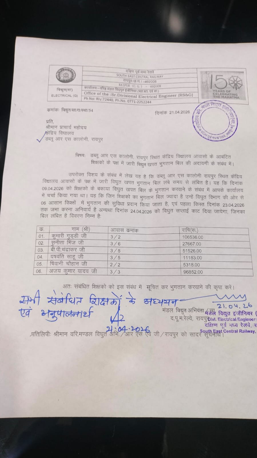 रायपुर , विद्या भूषण दुबे-  खबर योद्धा ।। रेल्वे प्रशासन के WRS कालोनी में निवासरत केंद्रीय विद्यालय की शिक्षक शिक्षिकायें विगत कुछ महीनों से अपने विभाग और रेलवे विभाग के दो पाटों के बीच में पीस रहे हैं। दरअसल पूरा मामला बिजली बिल भुगतान को लेकर है। मामला कुछ यूं है कि दपुम रेलवे विद्युत विभाग ने केंद्रीय विद्यालय के 6 कर्मचारियों को लाखो रुपये तक बिल जमा करने का नोटिस जारी किया है।
